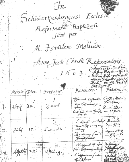 Abbildung 1: Ausschnitt der ersten Seite des Taufbuchs von Schwarzenberg, 1603 (LKA Mikrofilme 1125/26) Rechts neben der Jahreszahl ist die Geburt von Georg Braun (1599), Bruder des Christmann Braun (des Jüngeren), nachgetragen (vgl. 3.13). |